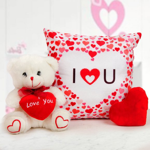 Shower all the love tucked in the corners of your heart on your special one with this endearing love combo. Your combo contains: - A tiny cuddly heart-shaped cushion - A 6 inches cuddly bear saying "I Love You" - A 12x12 inches digitally printed "I Love You" Cushion
