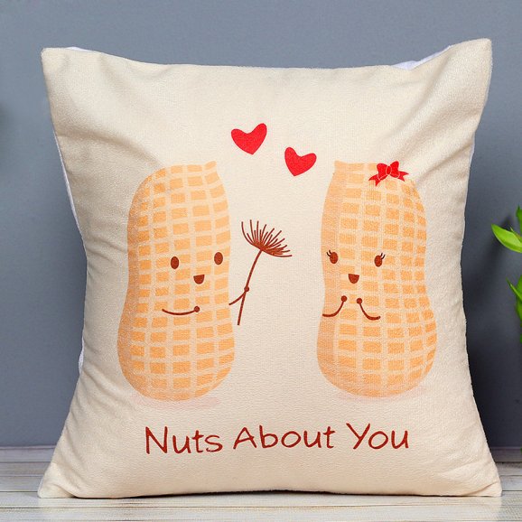 Love knows no bounds and it makes you feel alive. Once you fall in love everything else seems insignificant in comparison to your partner. This cushion illustrates the message perfectly, saying " Nuts about you". The pun is quintessential with the portrayal of peanuts gifting a dandelion is a hilarious yet clever depiction of love.