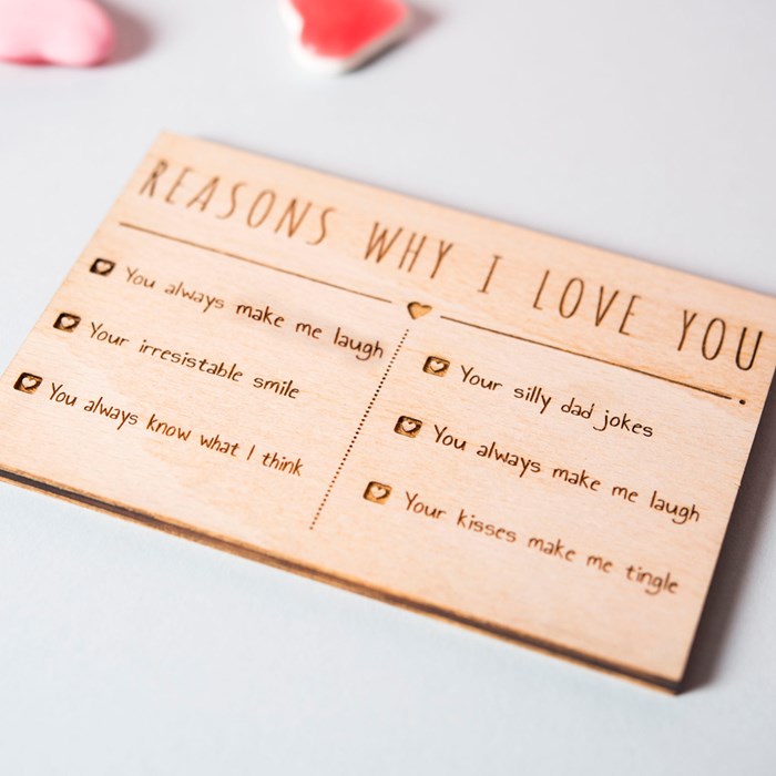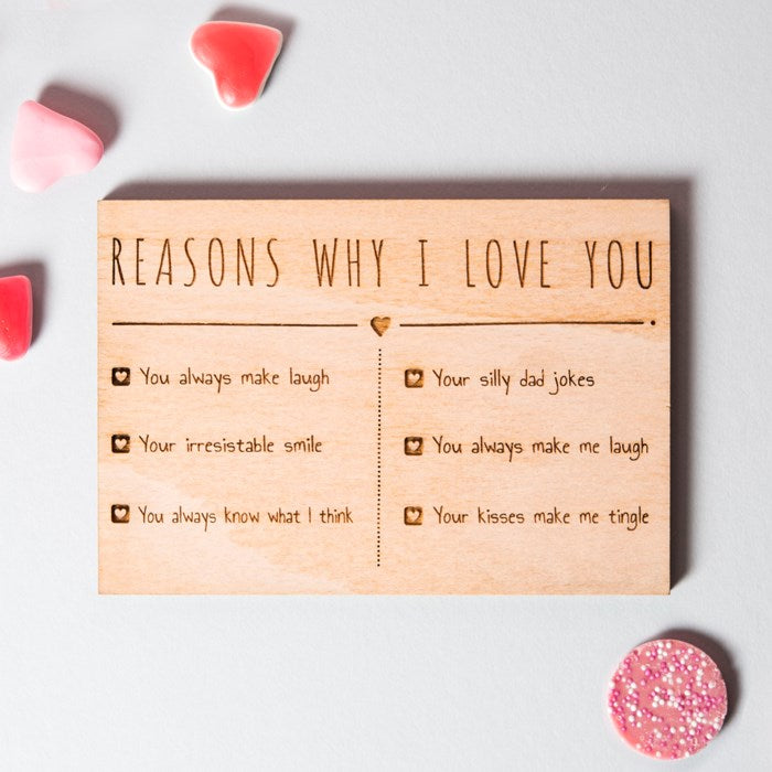 Tell someone special exactly why you love them with our Wooden Postcard! It can be engraved with six reasons why you love them. It's a romantic keepsake that's perfect for an anniversary or Valentine's Day!